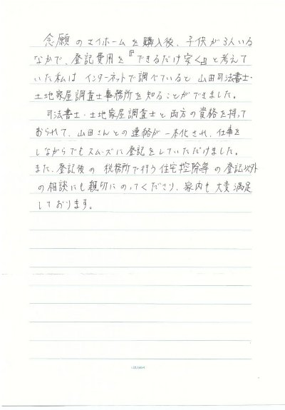 また、登記後の税務署で行う住宅控除等の登記以外の相談にも親切にのってくださり、家内も大変満足しております。